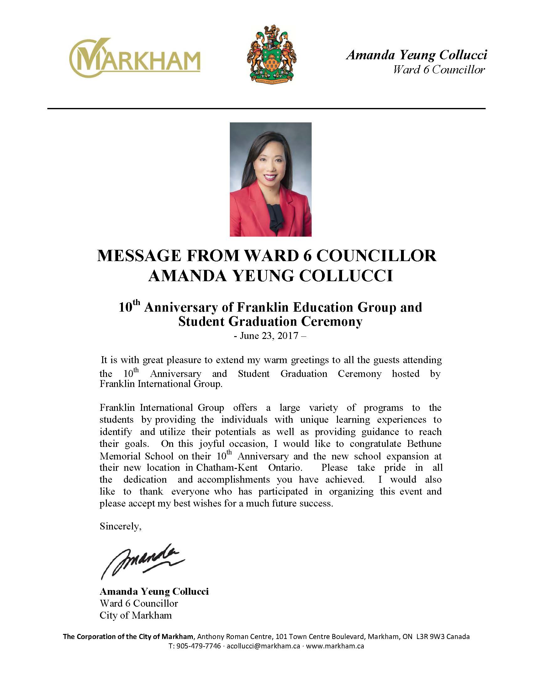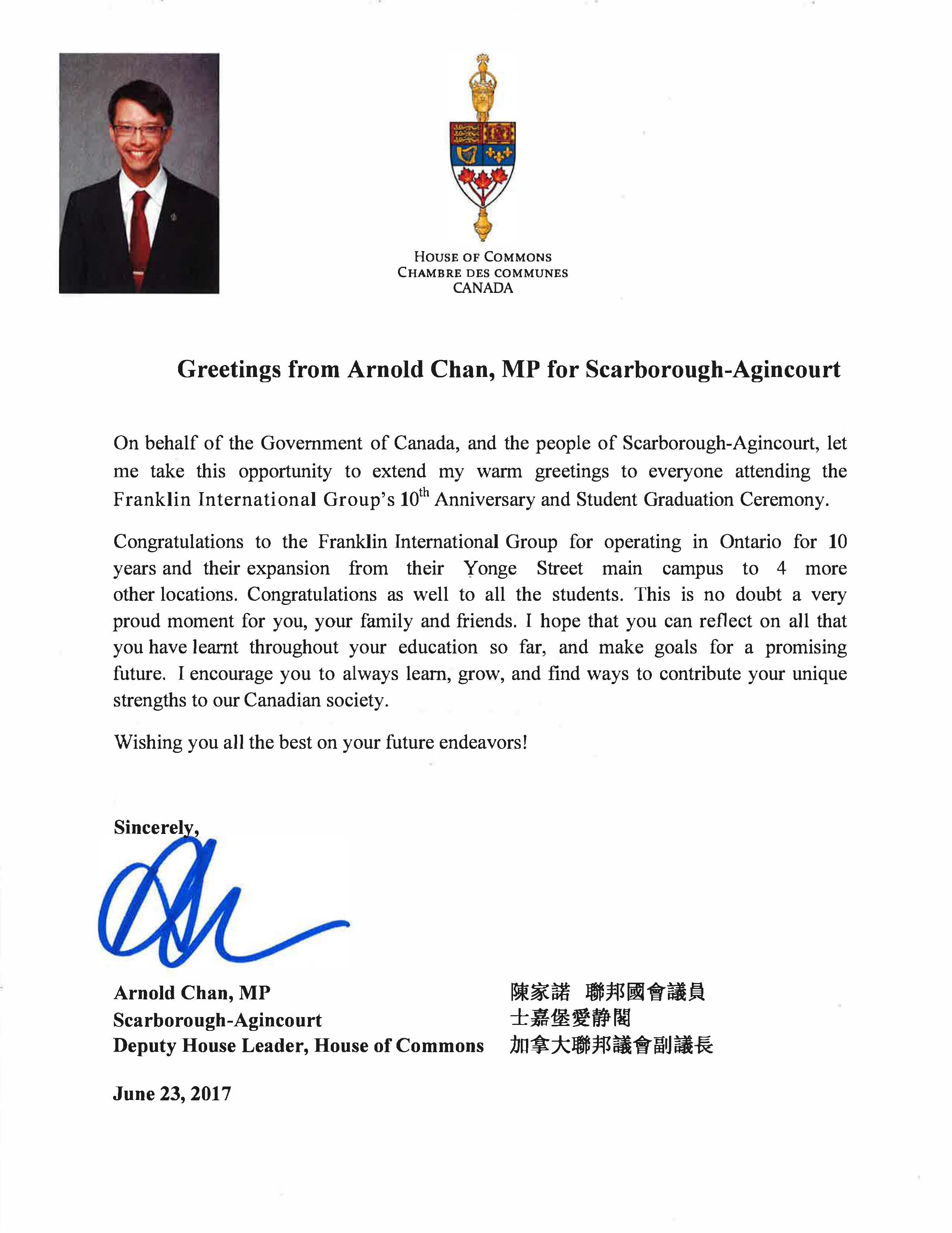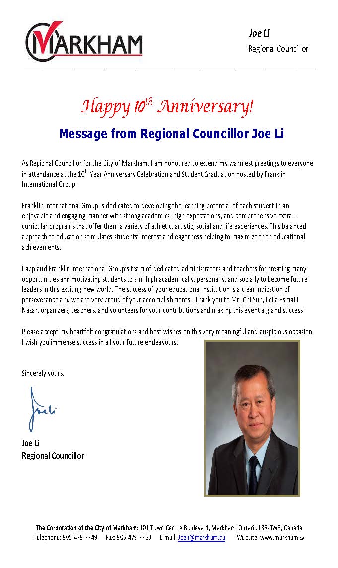月,成立至今培养了无数优秀的学生。2010年获得加拿大总理-特鲁多,多伦多市长John Tory,加拿大联邦会会长Arnold Chan,加拿大移民局Joe Li markham区长Amanda, Richmondhill 区长Reza Moridi, 的一致推荐。